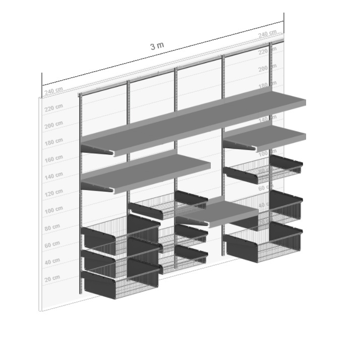 В комплект входят несущие рельсы и навесные направляющие, полки, штанги, аксессуары, крепежные элементы. Можно докупить множество дополнительных компонентов для гардеробной системы.