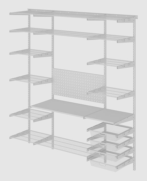 В комплект входят несущие рельсы и навесные направляющие, полки, штанги, аксессуары, крепежные элементы. Можно докупить множество дополнительных компонентов для гардеробной системы.