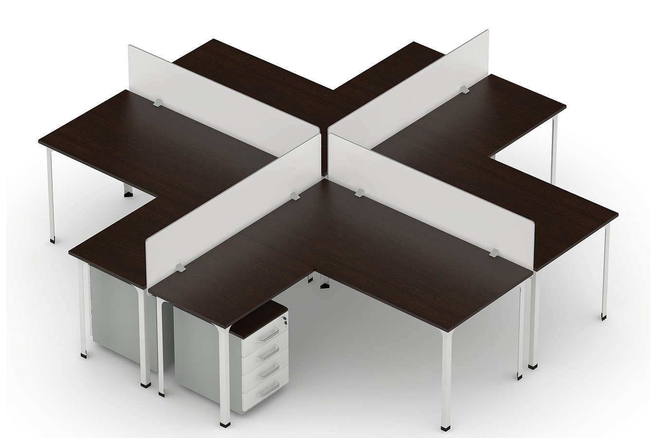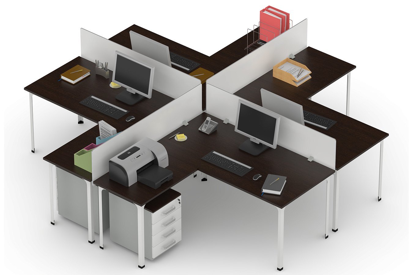 Удобное рабочее место для четырех человек. Используется в офисах, бизнес-центрах, на предприятиях и в других организациях. Рабочее место формируется из 4 столов офисных, 4 столов-приставок и 4 экранов.