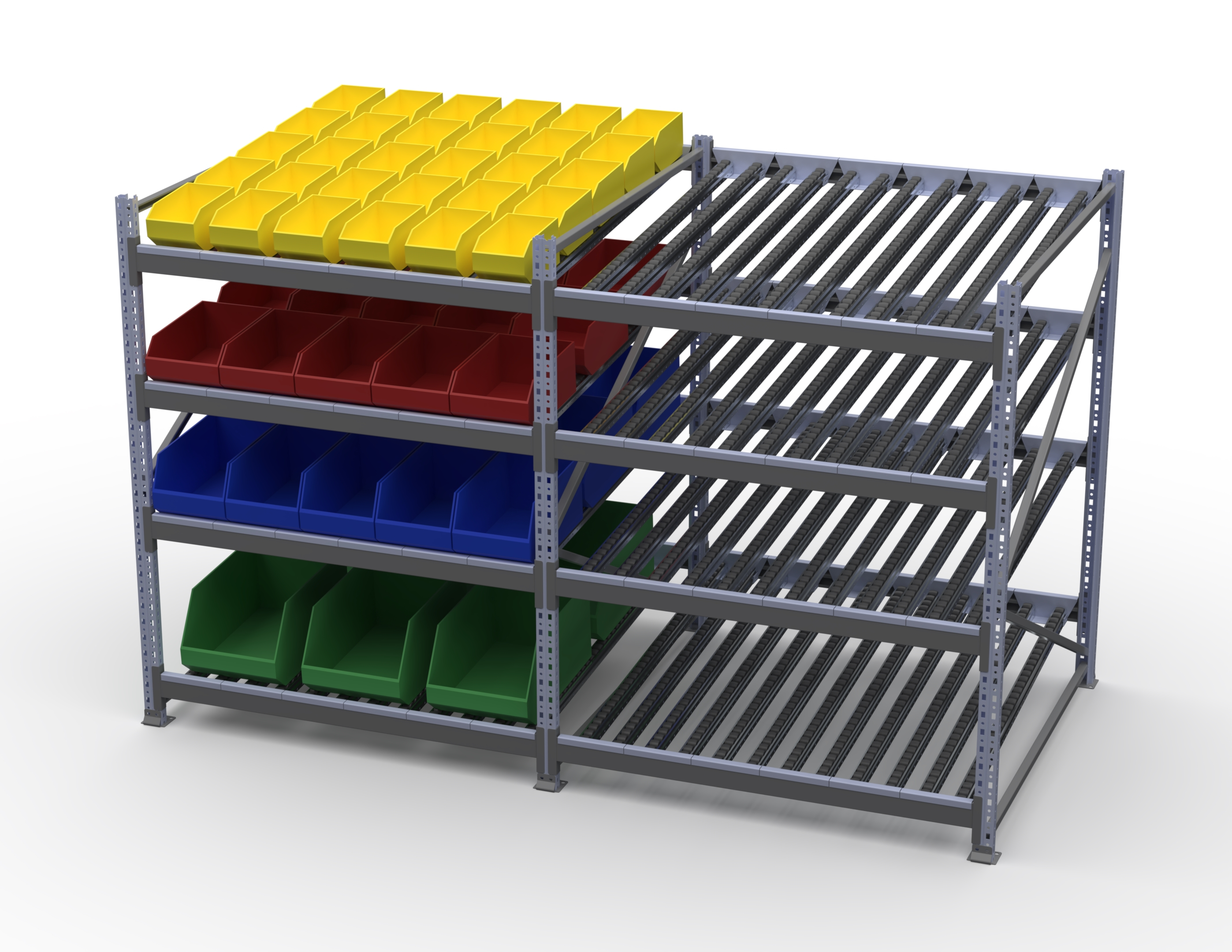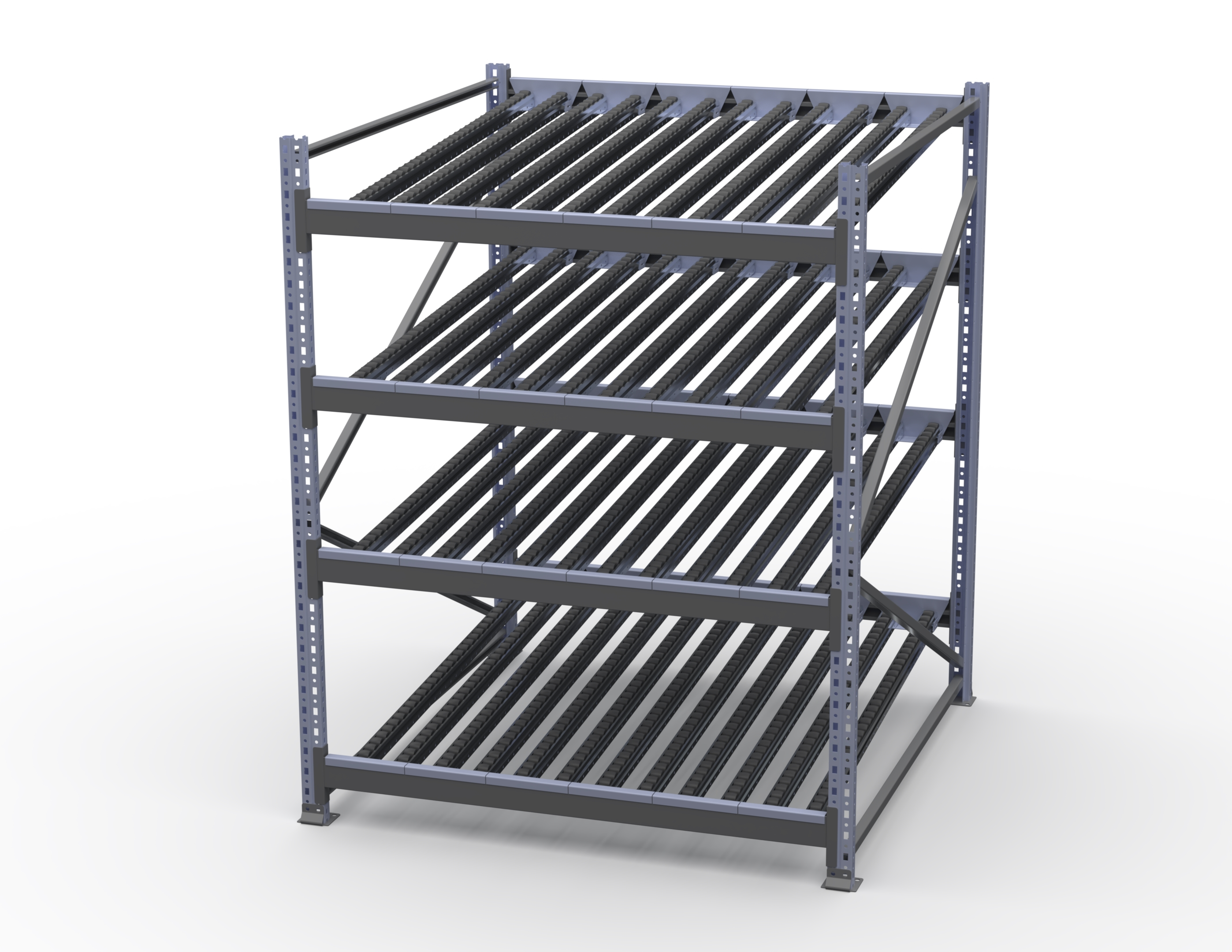 Конструкция с наклонными роликовыми полками обеспечивает гравитационную подачу тары к зоне отбора, благодаря чему товар перемещается по принципу FIFO (первый пришёл — первый ушёл). Это позволяет ускорить обработку заказов, повысить организованность хранения и увеличить эффективность работы персонала.