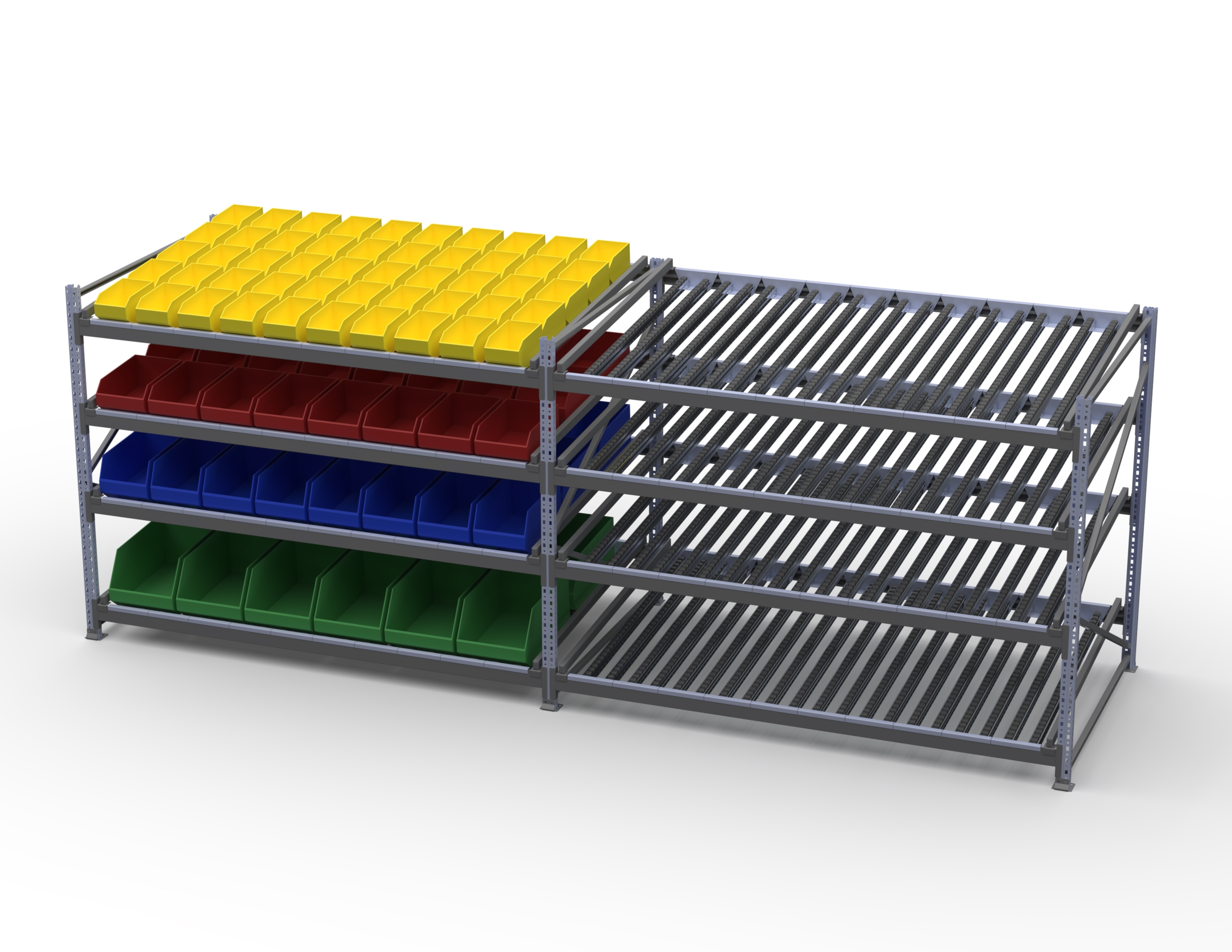 Гравитационный стеллаж с роликовыми полками 1600х2100х1300, 4 яруса