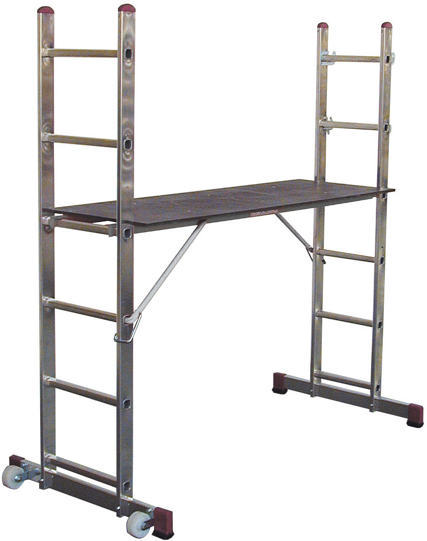| • Допустимая нагрузка до 200 кг/м2 • Погодостойкий противоскользящий настил из панели, пропитанной фенольной смолой • Быстрый монтаж без инструментов, алюминиевые подмости состоят только из 5 элементов • Небольшие размеры позволяют свободно проезжать через дверные проемы в собранном состоянии • Благодаря изменению высоты платформы с интервалом от перекладины к перекладине возможна установка подмостей на лестницах и уступах • Идеальны для внутренних работ |