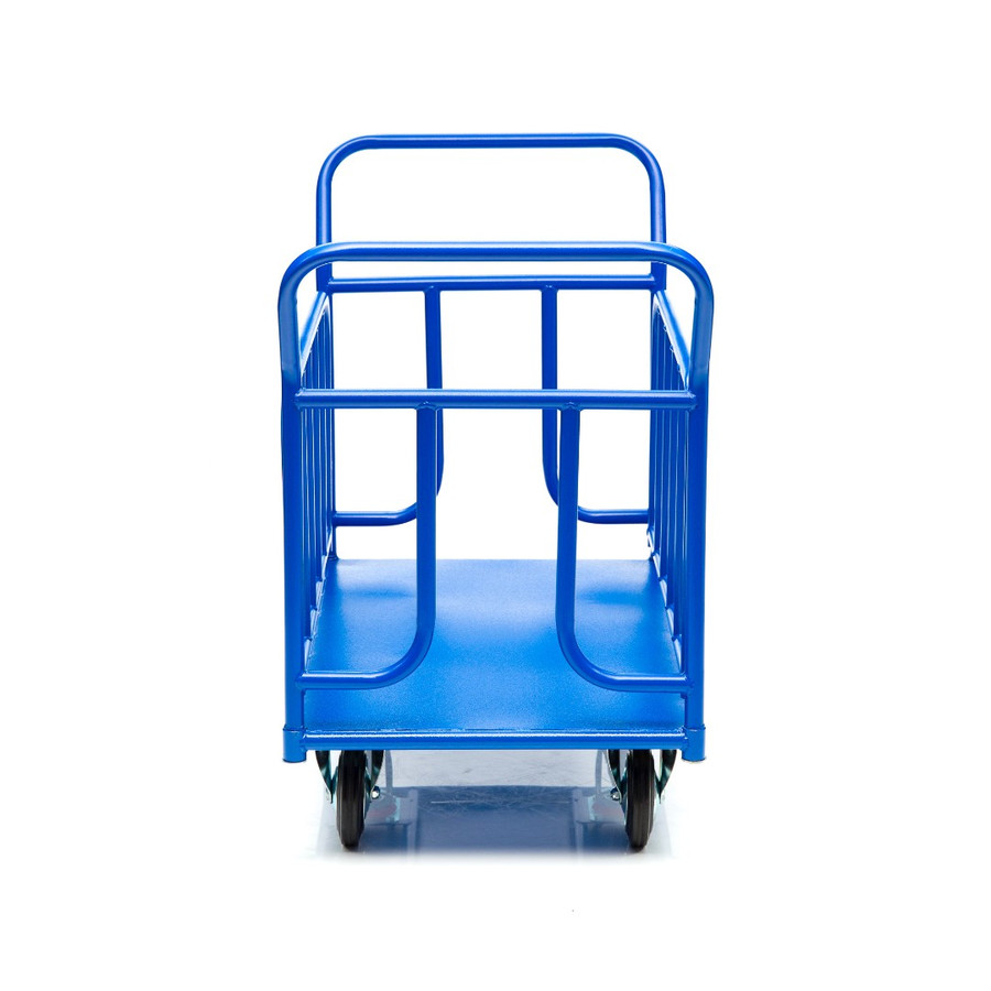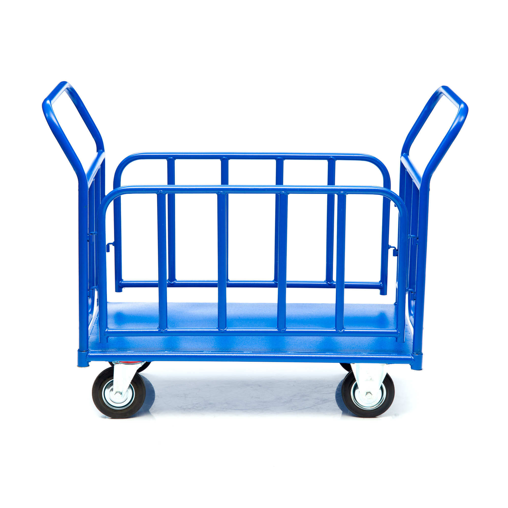 Платформенная 4-х колесная тележка с трубчатыми бортами КПО-500Т используется для транспортировки различных сборных грузов на оптовых базах и складах. Размер платформы 800х1200мм. Металлический борт защищает груз от падения и ударов, что позволяет перевозить хрупкие предметы и сборные грузы. Ручки и борта тележки снимается для удобства транспортировки и компактного хранения. Высота боковых бортов 400мм., высота борта от платформы 480мм., высота ручки 750мм., каркас платформы труба диаметром 28мм. Настил металлический лист толщиной 1,2мм. ручка труба диаметром 28мм., толщина 1,5мм. Каркас борта труба диаметром 25мм., толщина 1,5мм. Платформа имеет уникальную рельефную, полимерную, противоскользящую поверхность. Цвет синий, шагрень. Для легкого перемещения тележка КПО-500Т комплектуется 2 поворотными и 2 неповоротными колесами, изготовленными из высококачественной литой резины.