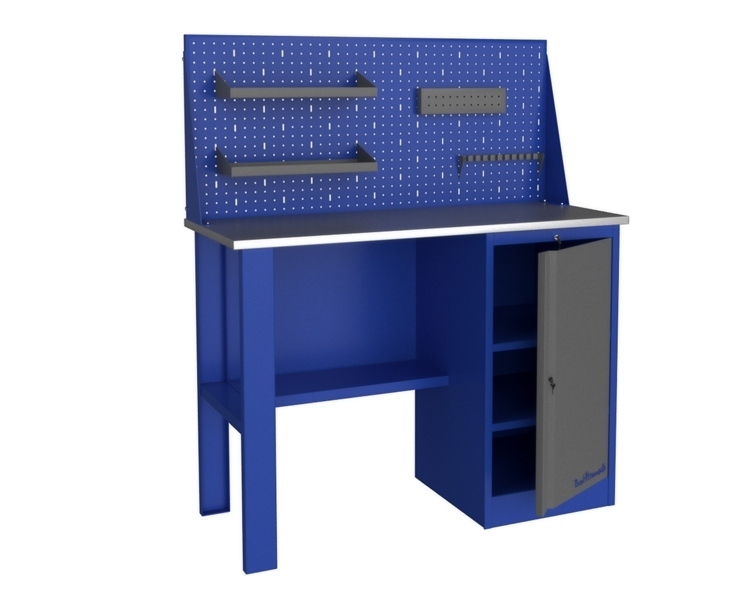 Верстак представляет собой устойчивую модель – в качестве опор служат две ножки, а также массивная тумба. Дополнительно верстак оборудован нижней полкой, одной тумбой, экраном. Тумба довольно объемная, имеет две полки внутри, оснащена дверью. На экран навешиваются специальные приспособления (навески) для складирования инструментов.