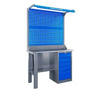 Над рабочей поверхностью верстака возвышается защитный экран с перфорацией. В отверстиях экрана удобно размещать по своему усмотрению специальные держатели и полочки для инструментов.