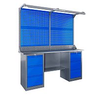 Столешница верстака закреплена на двух вместительных тумбах с дверцами. Тумбы оснащены полками, на которых можно хранить рабочие инструменты, запасные детали и материалы. Для надёжной сохранности инвентаря и деловой документации на дверцах предусмотрена возможность закрепления замочка.