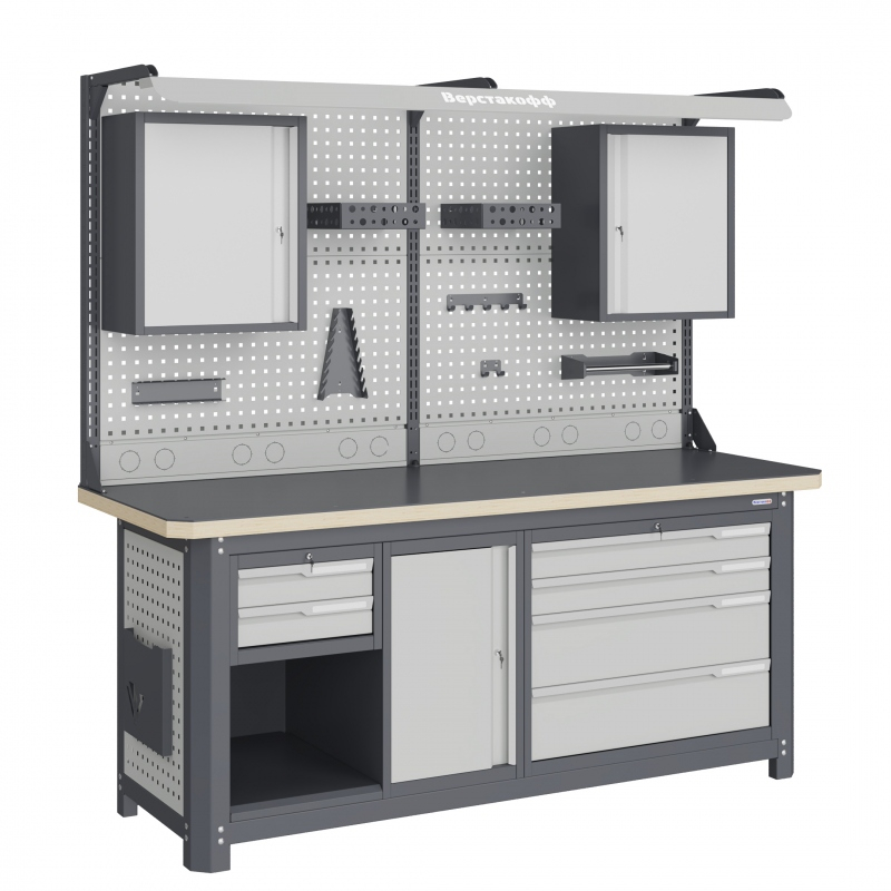 Рабочее место серии MECHANIC: MCN 2052.S27L4.2-2FR состоит из столешницы шириной 1993 мм, рамы верстака, состоящей из опор, перемычек, боковых перфопанелей, одного малого подвесного модуля S2, одного малого модуля S7, одного большого модуля L4, двойного экрана с кронштейнами, комплекта освещения и блока коммуникаций, двух навесных шкафов, двух лотков №1, одного держателя ключей, одного держателя отвёрток, одного держателя рулона, одной вешалки №1, одной вешалки №2, одного кармана для документации.