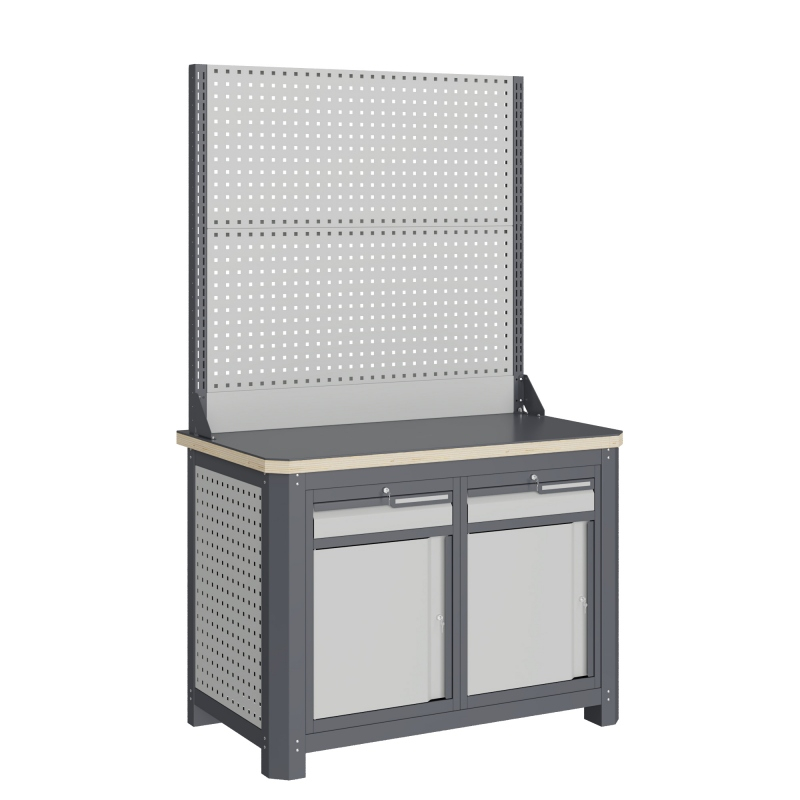 Рабочее место MECHANIC: MCN 1252.S88-2 состоит из столешницы шириной 1193 мм, рамы верстака, состоящей из опор, перемычек, боковых перфопанелей, двух небольших модулей S8 (один ящик и дверца), двойной экран с кронштейнами.