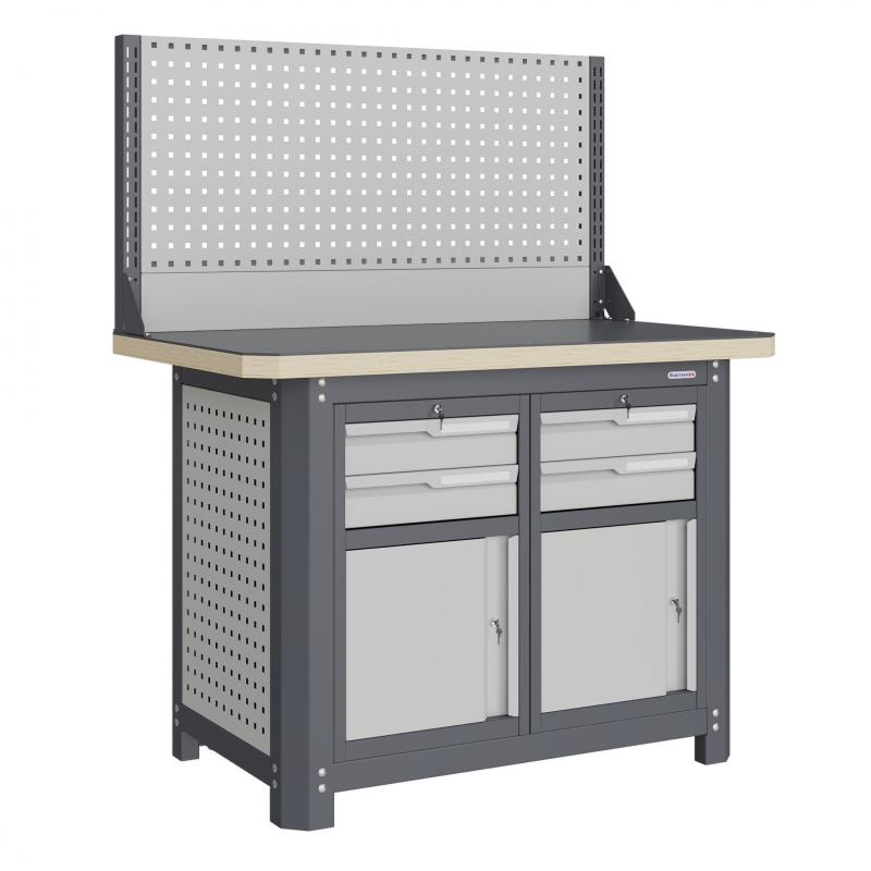 Рабочее место MECHANIC: MCN 1252.S99-1 состоит из столешницы шириной 1193 мм, рамы верстака, состоящей из опор, перемычек, боковых перфопанелей, двух небольших модулей S9 (два ящика и дверца), экрана с кронштейнами.