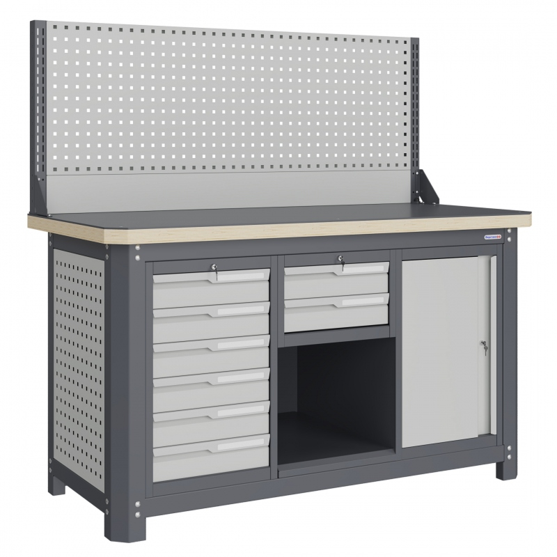 Верстак серии MECHANIC: MCN 1552.S267.2-1 состоит из столешницы шириной 1493 мм, рамы верстака, состоящей из опор, перемычек, боковых перфопанелей, малых модулей S6, S7 и модуля S2 с комплектом полка-стенка SW2, одинарного экрана с кронштейнами.