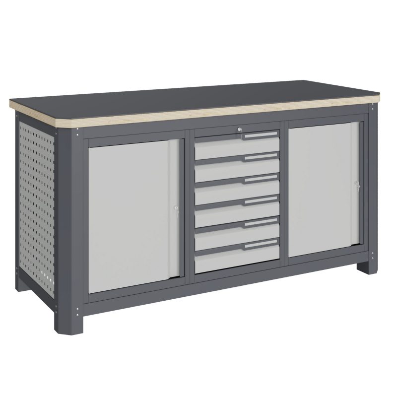 Верстак серии MECHANIC: MCN 1552.S677 состоит из столешницы шириной 1493 мм, рамы верстака, состоящей из опор, перемычек, боковых перфопанелей, малых модулей S6, S7.