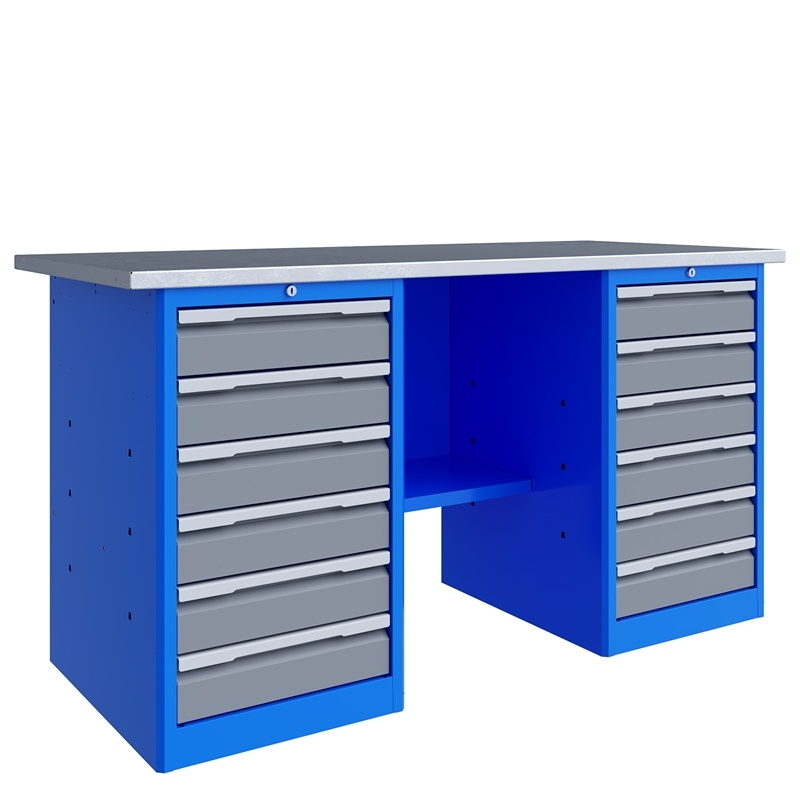 Тумбы верстаков выполнены сварными. Ящики в тумбах устанавливаются на шариковых телескопических направляющих полного выдвижения. В тумбе P6 установлено шесть малых ящиков. Внутренние размеры малых ящиков (ВхШхГ), не более: 103 х 397 х 520 мм. Тумбы с ящиками снабжены общим центральным замком с поворотом ригеля 180 градусов и подпружиненной тягой. В комплекте два ключа с каждой тумбой.