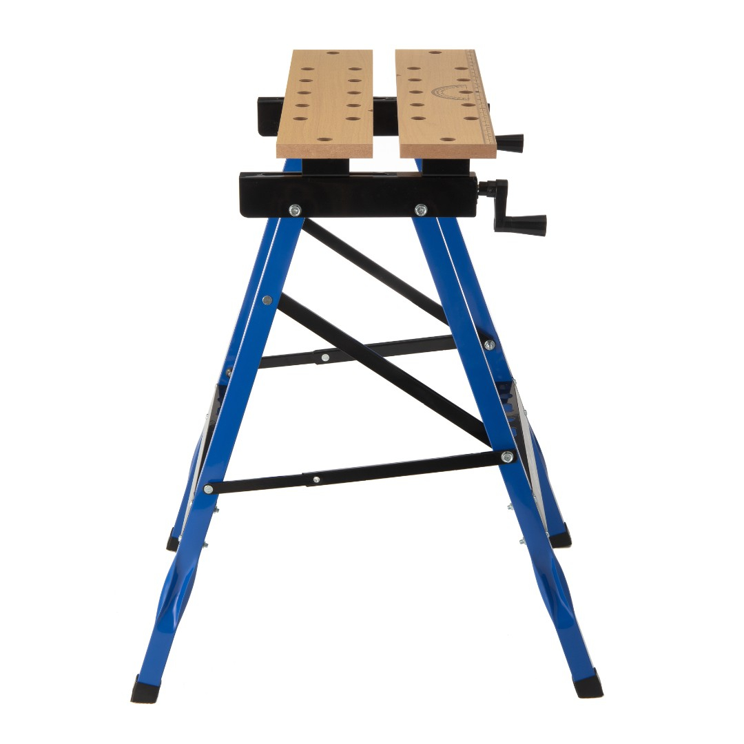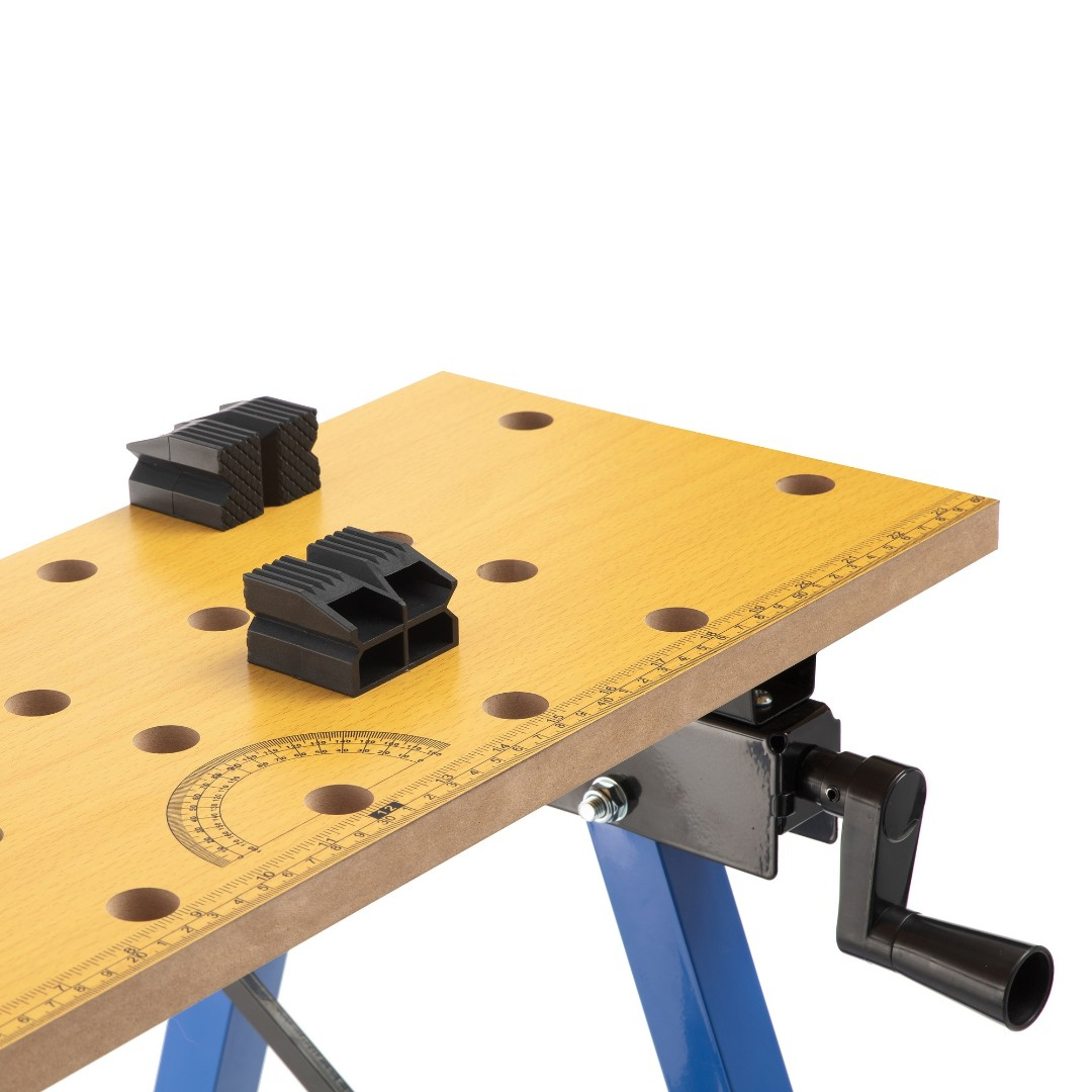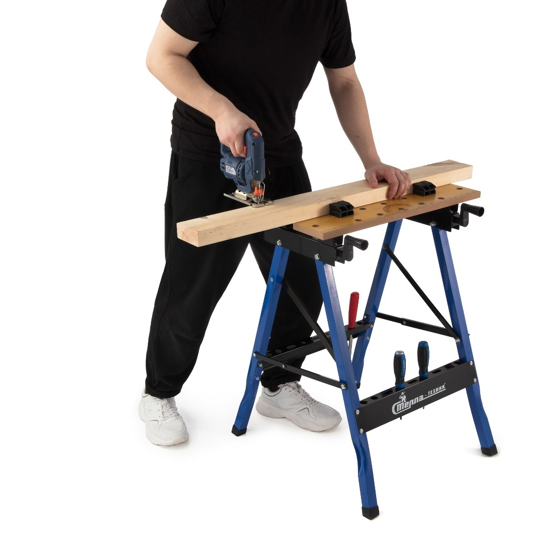 Верстак универсальный имеет две деревянные, подвижные столешницы с V образными пазами для зажима прямоугольных деталей. Столешницы двигаются по направляющим металлическим опорам (с помощью двух ручек) под необходимый размер заготовки.